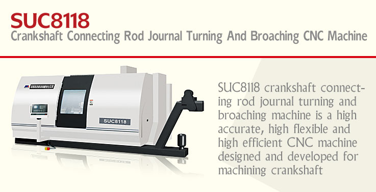 SUC8118 crankshaft connecting rod journal turning and broaching machine is a high accurate, high flexible and high efficient CNC machine designed and developed for machining crankshaft connecting rod journal in automobile industry. It is mainly applied to machining crankshaft connecting rod journal excircle, shaft shoulder, thrust face, round angle or sink ore channel etc. This machine consists of bed, left & right headstocks, right (left & right) longitudinal & cross slides, right (left & right) turrets, inspection system, CNC system, servo system, electrical system, hydraulic system, cooling system, conveyor, lubrication system and guard system etc.